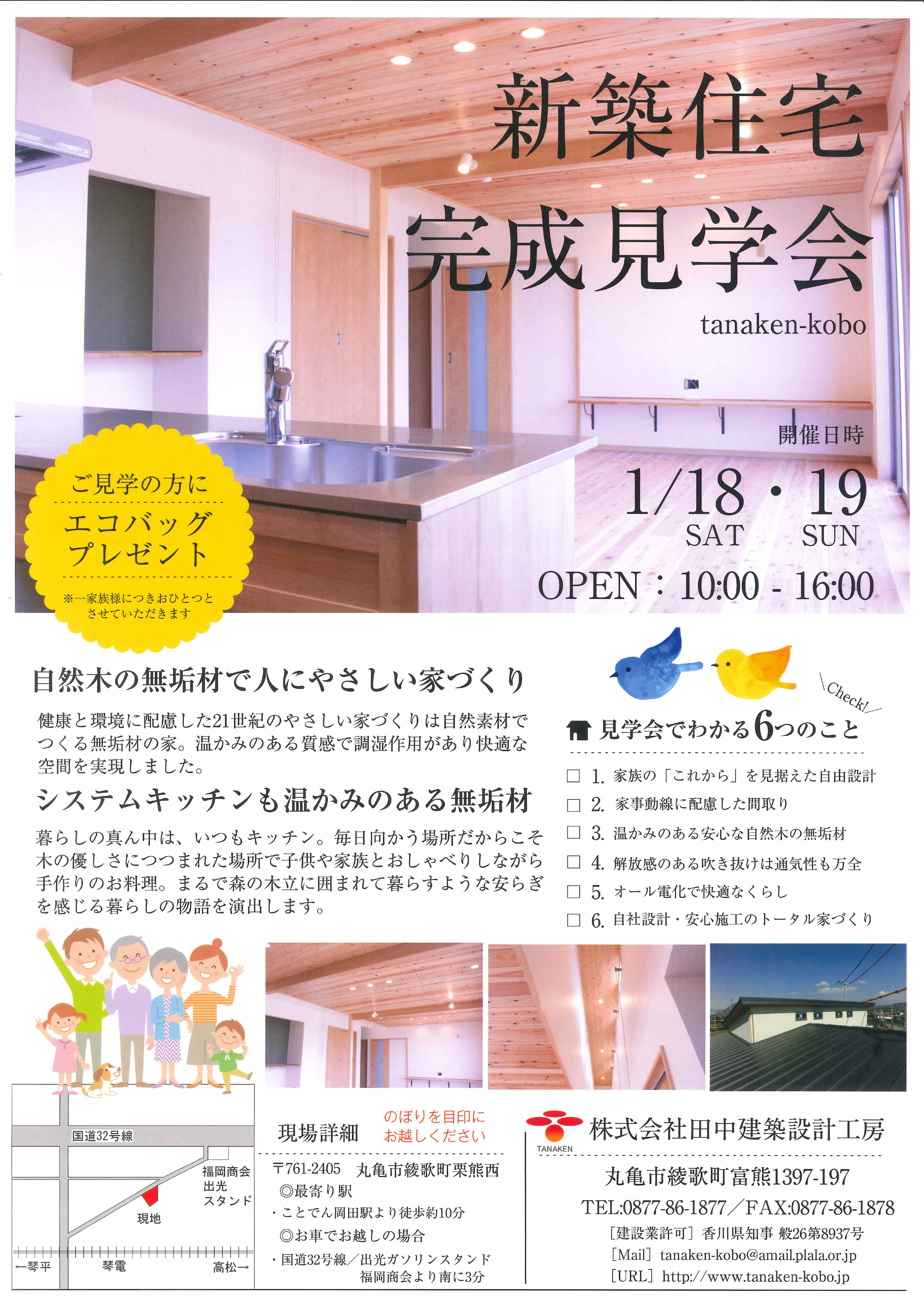 2020年1月18日(土)・19日(日)丸亀市綾歌町栗熊西にて新築住宅完成見学を行います。